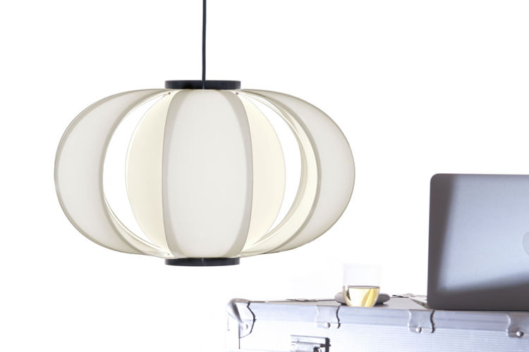 La lámpara, diseñada en 1952, se compone de finas lamas de madera que
